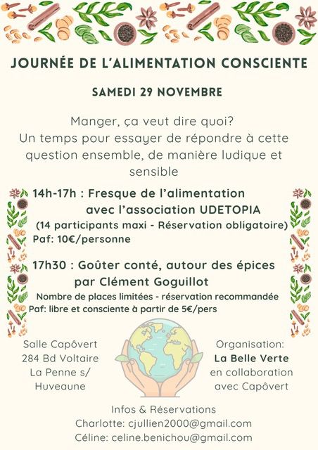 Capôvert propose un après-midi autour de l’alimentation consciente le 29 Novembre . Ce sera aussi le premier événement organisé par La Belle Verte, ça se fête! Nous proposerons aussi une petite buvette à l’issue du spectacle.